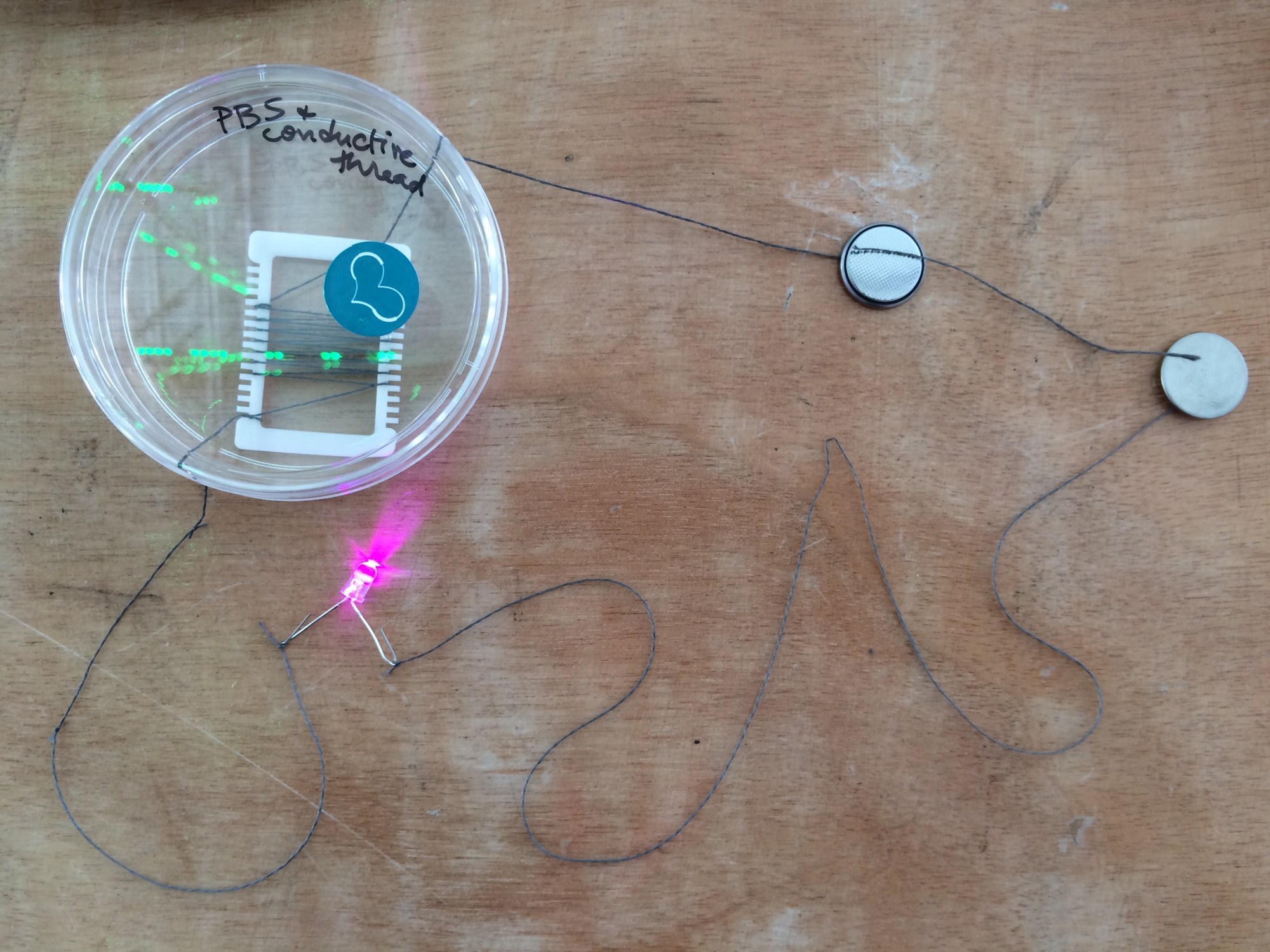 n=1, n=2 – consistent electric current moving through the conductive thread even when submerged in the two different fluids (one sodium based, one glucose based). Proving possibly safe/useful for mammalian cell culture for future experiments with charging cells.